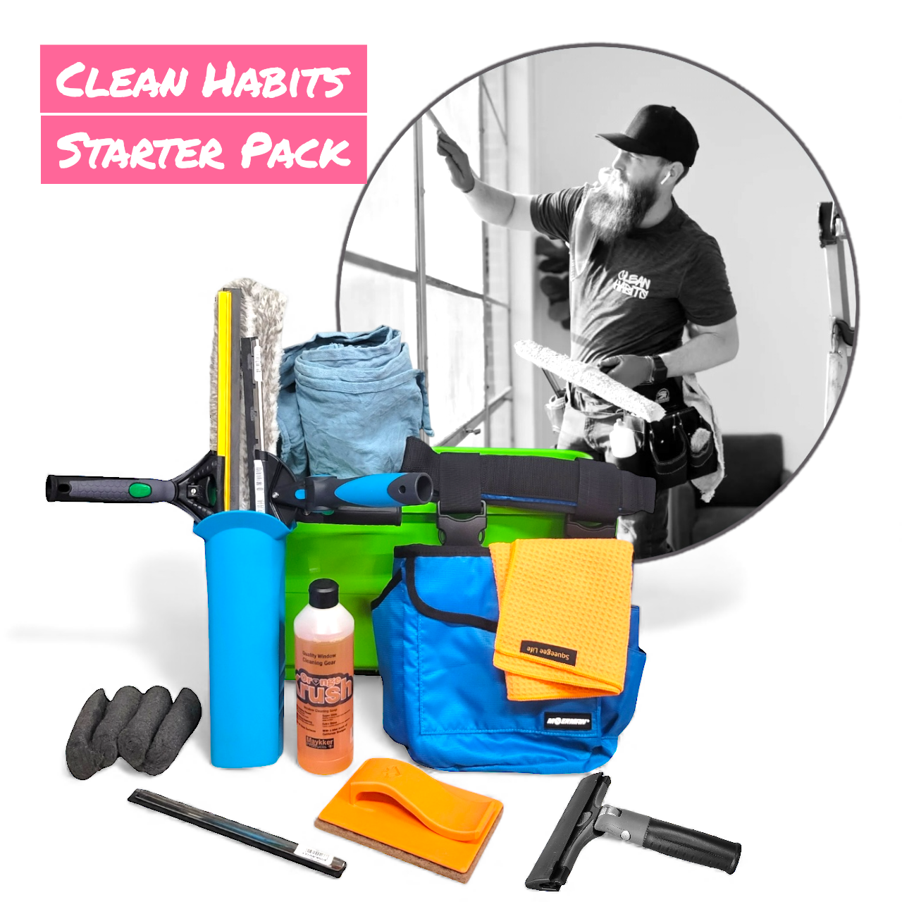 The Clean Habits Starter Kit is a curated selection of professional window cleaning tools, assembled by an industry veteran who continues to work in the field and refine his gear daily. Every item in this kit has been tested, trusted, and proven effective under real world conditions.