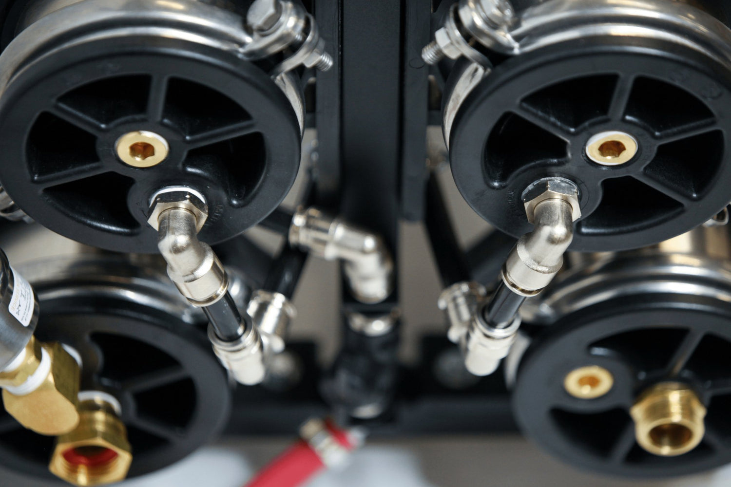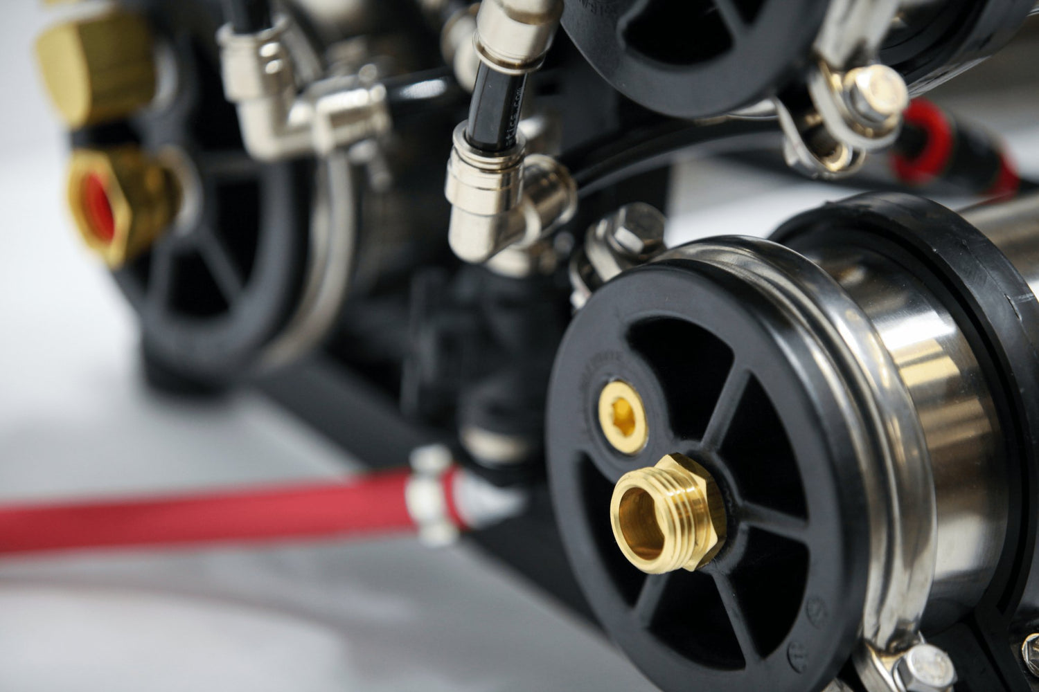 Equipped with serviceable stainless-steel housings and ultra–low-pressure reverse osmosis membranes, it produces a high flow of pure water efficiently—even under reduced inlet pressure. The powder-coated steel frame with rubber feet ensures stability and long-term durability.