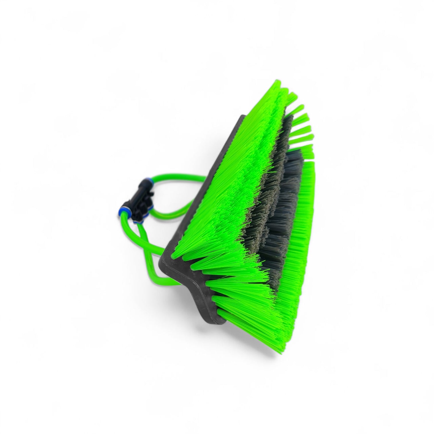 A 12-inch water fed brush with a tri-level bristle design built for window cleaning. Features stiff inner bristles for scrubbing, flexible middle bristles for corners, and angled outer bristles for sills. Four jets provide high water flow.